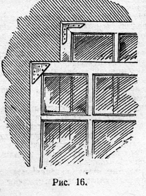 Расшатавшуюся оконную раму можно укрепить при помощи железных угольников (рис. 16), которые продаются в магазинах хозяйственных товаров. Если угольников под рукой нет, их следует вырезать из жести или кровельного железа. Толщину угольника и размер нужно подбирать в зависимости от величины рамы и того напряжения, которое ей придется выдерживать.