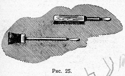 Очистка пылесборника. Хорошая очистка пылесборника имеет большое значение для работы пылесоса. Забитые пылью фильтры затрудняют работу пылесоса, уменьшают тягу воздуха. Простым стряхиванием, которым часто ограничиваются, нельзя освободить матерчатые фильтры от пыли. Для их очистки надо обзавестись щетками. Удобны щетки двух типов: плоские широкие и узкие длинные (рис. 25). Такими щетками легко удалять пыль как из пылесборника, так и с матерчатых фильтров.