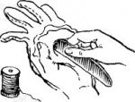спитым чаем: влажный чай рберет в себя всю пыль. Рекомендуется также пользоваться при подметании влажными опилками (достаточно рассыпать несколько горстей опилок и затем тщательно подмести). Можно подметать пол, обернув щетку влажной марлей, так, чтобы щетина прошла наружу (рис. 20).