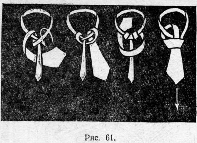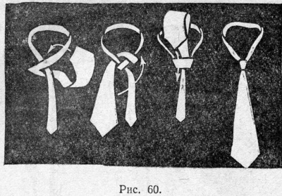 1. Галстук обводят вокруг шеи так, чтобы узкий конец оказался слева и был значительно короче широкого. Придерживая этот конец левой рукой около застежки воротника, правой делают петлю длинным, более широким концом (рис. 60). Затем этот конец продевают в петлю, как указано на рисунке. Петля затягивается, узел выравнивается. Галстук завязан.