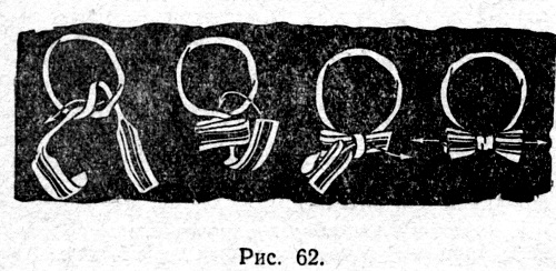 Кроме обычных длинных галстуков, существуют и галстуки, завязывающиеся «бабочкой». Распространены они у нас гораздо меньше, чем первые, но некоторым нравятся. Завязывается «бабочка», как показано на рисунке 62. Сначала делается два узла подряд, так, чтобы после второго образовалась петля, а свободные концы галстука оказались равной длины. Затем пропускают в петлю один конец справа налево, другой — слева направо и затягивают.