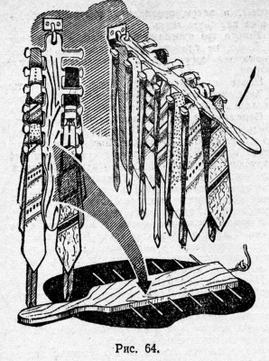 Обычно галстуки подвешивают на шнуре, укрепленном с внутренней стороны дверцы шкафа или кладут в продолговатую коробку. Но, чтобы галстуки хорошо сохранялись и не были мятыми, лучше иметь для них специальную вешалку. Ее можно выпилить лобзиком из тонкой фанеры или из пластмассы. Образец показан на рисунке 64. Можно также в дощечку толщиной 5—6 мм и шириной 6—7 см вбить с двух сторон короткие металлические стержни (гвозди без головок). Подвеска галстуков показана на рисунке 64.