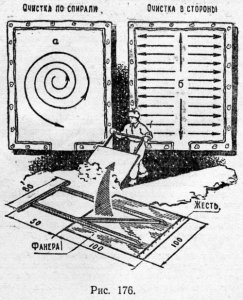 Оборудовав каток, нужно хорошо следить за ним, после каждого снегопада расчищать, отодвигая снег лопатами и движками (рис.176), подальше к краям. При этом надо идти как бы по спирали от центра катка к его границам или от середины в стороны (рис. 176). Сдвинутый в стороны снег нужно вывозить на санках, чтобы площадь катка не уменьшалась. Если накануне на катке было много катающихся, следует с утра подмести каток и полить его вручную. Это должны делать те, кто пользуется катком, в порядке заранее расписанных дежурств.