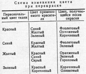 Темная вещь или вещь с ярко выделяющимся рисунком поддается окраске только в более темный цвет, причем в этом случае чистого тона может и не получиться. Например, если хотят окрасить в синий цвет вещь из желтой ткани, то она чаще всего станет зеленоватой, красная материя — тускло-лиловой и т. д.