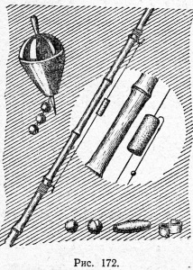 Крючок должен быть прочным и острым. Размер его зависит от того, для какой ловли он предназначается, и от насадки. Для начала надо брать крючки № 4—7. Крючок перед каждой ловлей полагается подтачивать на бруске. С крючками надо обращаться очень осторожно, не бросать их где попало. На удочке, когда ловля не производится, крючок должен быть воткнут в пробку (рис. 172).