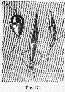 Поплавок можно купить готовый или сделать из пробки либо сосновой коры (рис. 171). Ярких, пестрых поплавков надо избегать. Цвет поплавка должен приближаться к цвету предметов, обычно находящихся в воде.