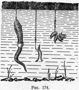 Крючок надо вводить в насадку так, чтобы жало его оказалось снаружи (рис. 173) и могло легко вонзиться в тело рыбы. Открытое положение крючка не помешает ловле. При нескольких удочках полезно в начале ловли насадить каждую из них разной насадкой (рис. 174). Это поможет определить, на что в данном случае рыба будет лучше клевать.