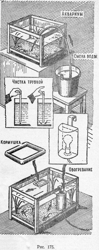Время от времени аквариум нуждается в основательной чистке. Это надо делать тем чаще, чем больше в аквариуме рыб, а также по мере загрязнения воды остатками корма и нечистотами. Такую воду необходимо сменить. Для этого рыб вылавливают небольшим сачком и помещают в плоскую чашку, прикрыв ее стеклом, чтобы они не выпрыгнули. Затем, пользуясь обыкновенной резиновой трубкой, выливают загрязнившуюся воду. Для этого трубку, которая примерно в 2,5—3 раза длиннее глубины аквариума, наполняют водой, затыкают один конец пальцем, а другой опускают в воду до самого дна. После этого палец отнимают. Вода начнет вытекать из трубки и потянет за собой воду из аквариума (рис. 175). Так же поступают и при наполнении аквариума. Ведро с чистой водой ставят несколько выше верхнего края аквариума и трубкой переливают воду. Лить воду прямо из ведра не следует: широкая, сильная струя смоет песок и может повредить растения.