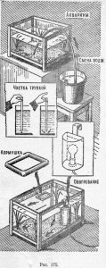 Прогревается вода в аквариуме проще всего при помощи электрической лампочки, вставленной в жестяной футляр, открытый с одной стороны (рис. 175). Футляр с лампой надо подвешивать с наружной стороны аквариума последовательно к каждой из четырех его стенок. Таким способом можно равномерно нагревать воду, поддерживая нужную температуру.