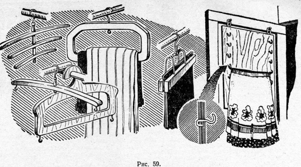 Плечики можно сделать с двумя и даже тремя, расположенными одна над другой, перекладинами (рис. 59). Верхняя перекладина должна быть шире второй, вторая — шире третьей. Плечики можно соединить также и с вешалкой для юбок или для брюк. Брюки можно держать также на вешалках с зажимами (рис. 59). Зажимать их сильно не следует, чтобы на манжетах не остались следы. Для одной юбки на концах плечиков ввинчивают по крючку (рис. 59).