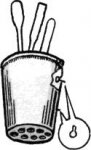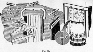 Существует еще удобная модель вешалки для нескольких юбок. Это — легкая, но прочная деревянная доска (можно взять толстую фанеру), которую подвешивают на петлях внутри шкафа — на боковой стенке или с внутренней стороны дверцы. Величина доски зависит от размера шкафа. По обоим краям ввинчивают на некотором расстоянии несколько пар небольших крючков, на которые и надо вешать юбки. Крючок выпиливается и из легкой ткани надо вешать сверху, более плотные—снизу (рис. 59).