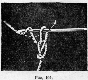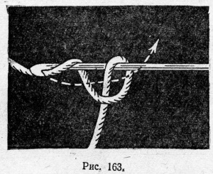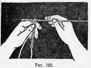 Крючок держат в правой руке за середину стержня, ближе к бородке, большим и указательным пальцами. Бородка должна быть обтащена влево (рис. 162). Средним пальцем также придерживают стержень крючка. Этот палец располагают впереди указательного, что способствует сбрасыванию законченной петли с крючка.