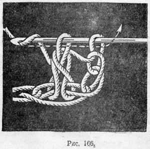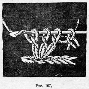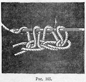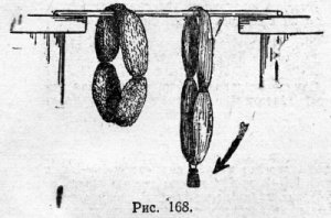 Мыть пряжу следует в порошке «Новость» или в мыльной пене. Затем пряжу развешивают для просушки — летом на воздухе, а зимой — в теплом месте, но не над плитой, чтобы просушивание было постепенным. Внизу мотка с пряжей нужно подвесить небольшой груз (рис, 168), тогда пряжа, высохнув, будет ровной, а не волнообразной.