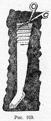 Использование старого трикотажа. Из трикотажных изделий, вышедших из употребления, очень легко сделать своеобразные шнуры для вязания. Например, старый чулок (особенно подходит для этой цели капроновый) надрезают ножницами по шву сверху примерно на 2 см. Не вынимая ножниц, последовательно, спиралью (рис. 169), разрезают весь чулок до конца, включая пятку. Получится тонкая сплошная трикотажная полоска. Неважно, что она будет не совсем ровной. Если ее сильно вытянуть перед вязкой, она сравняется. Затем полоску наматывают на клубок.