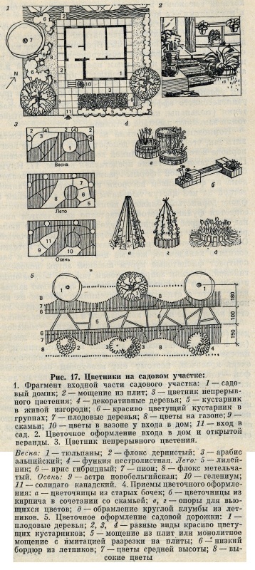 Многие любители-цветоводы любят клумбы — цветники круглой, овальной, квадратной или какой-либо другой геометрической формы. Времена высоких клумб с витиеватым и сложным геометрическим рисунком из цветов да еще с комнатным цветком — пальмой или агавой — в центре давно отошли в прошлое. Клумбы устраивают теперь более плоскими, приподнимая их над уровнем дорожки или газона на 10—15 см. Для ранневесеннего эффекта высаживают луковичные растения (тюльпаны, нарциссы), которые после их отцветания заменяют рассадой летников. Композицию из растений на клумбе нужно составить так, чтобы она была декоративной в течение всего периода вегетации — с ранней весны до поздней осени. Пример такого цветника представлен на рис. 17. Клумба прямоугольной формы размещена перед фасадом дома на фоне живой изгороди из кустарника. Ранней весной на ней цветут тюльпаны, арабис альпийский и флокс дернистый; ближе к июню зацветают скромные соцветия функии. Летом в цветение включаются пионы, затем ирис гибридный, лилейник, а в начале июля расцветает и цветет до сентября флокс метельчатый. Осенний эффект цветника создают золотистые метелки солидаго канадского, желтые цветки гелениума и как контраст фиолетовые кусты высокой астры новобельгийской. Цветник запроектирован так, что вступающие в свои сроки цветения многолетники зрительно закрывают места с отцветшими растениями. Многие из использованных здесь растений имеют декоративную листву, которая не портит композиции и после отцветания.