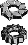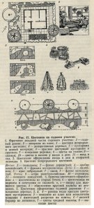 Простейший цветник — рабатка. Это полоса цветов шириной от 0,5 до 1,5 м, красочно окаймляющая дорожку, террасу дома. Ее выполняют, как правило, из 1— 2 видов летников, преимущественно низкорослых. Растения высаживают горизонтальными параллельными полосами или в виде несложного орнамента, чередуя 2—3 цвета. Для усложнения рисунка рабатки иногда в нее вводят и высокие растения. На рисунке приведен пример цветочного оформления садовой дорожки, вдоль которой высажены плодовые деревья с одной стороны и кустарники — с другой.