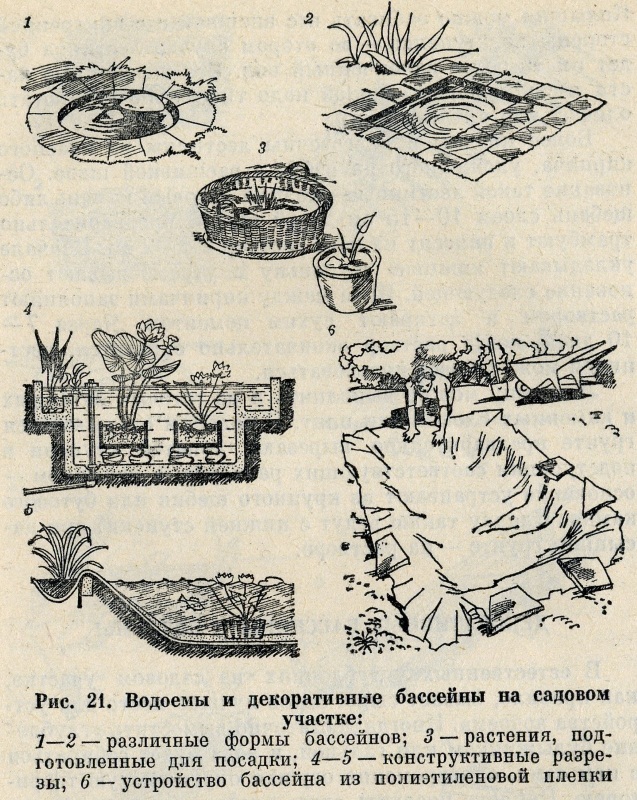 Существует несколько вариантов размещения водных растений. Простейший способ — укладка на дно бассейна камней и небольшого количества почвы, составленной из торфянисто-илистой земли, перепревшего коровяка и крупнозернистого песка. Сверху на такое основание насыпают слой песка. В промежутках между камнями высаживают растения. Однако при такой посадке растений уход за бассейном затрудняется. Гораздо удобнее высаживать растения в контейнерах — обрезках асбоцементных труб, ивовых плетеных корзинах, деревянных ящиках. Их можно легко вынуть, убрать, осмотреть корни растений, а водоем почистить. Чтобы придать контейнерам устойчивость, вокруг них укладывают крупную гальку. С наступлением холодов воду из бассейна спускают или вычерпывают, теплолюбивые растения убирают в помещение.