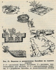 Простейший декоративный водоем диаметром около 1 м можно выполнить в любом месте участка, в том числе и рядом с садовым домиком, недалеко от водосточных желобов, чтобы его можно было наполнять дождевой водой. Для миниатюрных водоемов используют различные баки, бочки, старые ванны, закопанные в землю, устраивая вокруг них декоративное мощение.