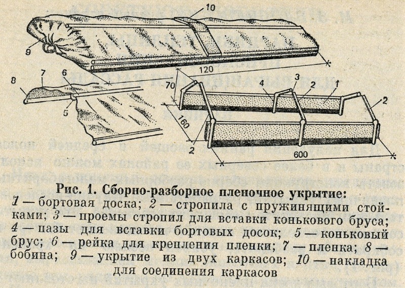 Для получения ранних овощей в средней полосе страны и в более северных ее районах можно использовать конструкции сборно-разборных малогабаритных пленочных укрытий, разработанные Научно-исследовательским институтом овощного хозяйства. Эти укрытия состоят из отдельных секций, что позволяет быстро их собирать и разбирать, убирая осенью на хранение (рис. 1).