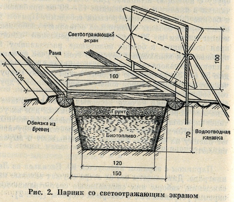 Парником с экраном пользуется Ю. Васильев из Ленинграда. Для защиты его от ветра служат зеленые насаждения, заборы или специальные светоотражающие экраны, устраиваемые с северной стороны (рис. 2).