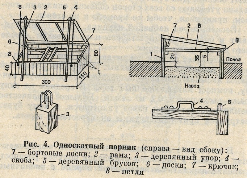 В течение ряда лет садовод А. Коломейцев из Челябинска выращивает огурцы, низкорослые томаты, перец, баклажаны в односкатном парнике шириной 1,5 м, длиной 3 м (рис. 4). Для лучшей освещенности располагает его по длине с запада на восток. Строить парник начинает с рытья котлована глубиной 0,5—0,6 м. В каждом его углу и посередине длинных сторон вкапывает столбы, к которым прикрепляет борта. Чтобы лучше сохранить тепло, он делает их двойными: внутренние доски располагает горизонтально, внешние — вертикально.