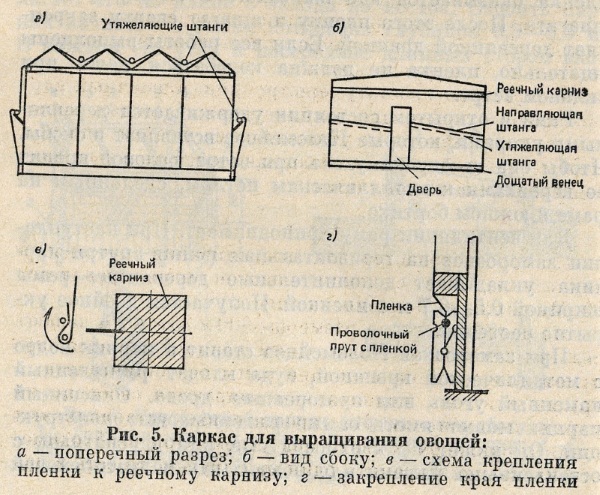 Удобный и надежный каркас для выращивания овощей изготовил Ю. Мороз из Днепропетровска. Конструкция его парника похожа на домик с двускатной пилообразной крышей (рис. 5). Для его изготовления не требуется специальных материалов. Боковые стенки вертикальные высотой 1,5—1,7 м, имеют в контакте с грунтом дощатый венец и реечный венец по карнизу. На стойках оставляются приливы-выступы с направляющей рейкой (штангой). Для стока воды штанге вдоль наружной стенки каркаса придан наклон. Пленка, образующая боковые стенки, сначала крепится к реечному карнизу, потом свободно спускается и прикрепляется внизу к дощатому венцу. Штангой, опущенной за боковые приливы, пленка постоянно натягивается. Для крыши каркаса берется пленка прямоугольной формы. Она натягивается на образующие каркаса так, чтобы швы располагались поперек их образующих. При этом швы не испытывают растягивающих усилий. Края пленочного полотна крепят к реечному карнизу. Благодаря наложению утяжеляющих штанг между ребрами крыши, пленка принимает упруго натянутое положение. В качестве штанг могут быть использованы металлический прут сечением 20—30 мм или старые водопроводные трубы, заполненные песком. Для уменьшения трения о пленочное полотно элементы конструкции обматывают старой пленкой.