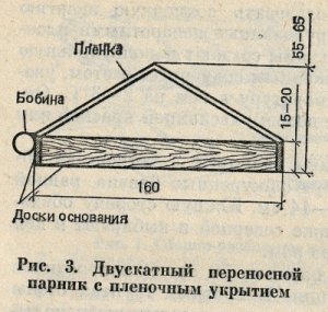 В последние годы рассаду в основном выращивают под пленкой. У садоводов-любителей получил распространение двускатный переносный парник с пленочным покрытием (рис. 3). Длина его 4—6 м. Основание парника — поставленные на ребро доски толщиной 2—3 и высотой 15—20 см. Стропила и конек парника изготовляют из деревянных реек сечением 5x2,5 см. Пленка по коньку прикрепляется рейкой (штапиком), натягивается она бобиной диаметром 7—8 см. Парник этот очень удобен. После выборки рассады его целесообразно использовать для выращивания огурцов или томатов.