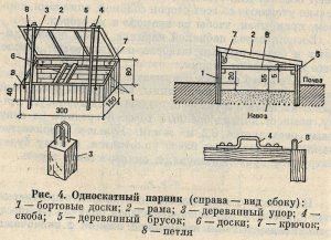 При заморозках Коломейцев ставит в парник ведро с металлической крышкой, куда кладет раскаленный каменный уголь или прогоревшие дрова. Описанный парник может иметь самые разнообразные конструкции. Он может быть односкатный или двускатный, с остекленными рамами или покрытыми полиэтиленовойпленкой, с откидным бортом только с южной или с трех сторон (юг, восток, запад). Для лучшей освещенности борта парника можно застеклить. На зиму рамы убирает в помещение. Срок службы парника 6—8 лет.