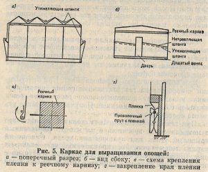 После тщательной подгонки и закрепления бортов гвоздями к столбам Коломейцев приступает к изготовлению рамы. Она состоит из сплошных или сбитых между собой деревянных реек шириной 5 и толщиной 3 см. Раму прикрепляет к северному высокому борту с помощью петель. При длине парника 3 м достаточно четырех петель. Затем набивает парник навозом, устанавливает внутри его термометр и натягивает пленку. Для уменьшения парусности покрытия на раму, с двух ее сторон, туго натягивает шпагат или леску в несколько рядов и крепит их гвоздями. Таким образом, пленка оказывается как бы зажатой между рядами шпагата. После этого пленку и шпагат сверху закрепляет деревянной дранкой. Если все работы выполнены тщательно, пленка не должна колебаться даже при сильном ветре.