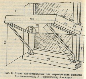 Простое устройство для выращивания рассады в комнате на окне с узким подоконником предлагает Ю. Мишарин из Челябинска (рис. 6).