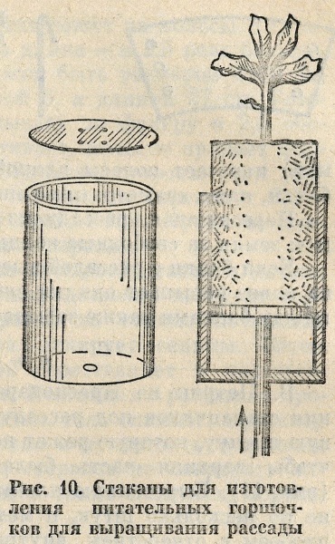 А. Кошкин из Москвы выращивает рассаду овощных культур в стаканчиках, сделанных из пластмассовых баллонов, в которых продается подсолнечное масло. Ножом он отрезает верхнюю часть баллона на расстоянии 10 см от дна и прокалывает в основании отверстие диаметром 10—12 мм. Вырезает из какого-либо негниющего материала кружок диаметром 60 мм, толщиной 2—3 мм, также делает в нем отверстие (диаметром 6—8 мм) и кладет его на дно стаканчика. Насыпав в емкость влажную почву и уплотнив ее, делает углубление на 1—1,5 см и кладет туда наклюнувшееся семечко ростком вниз и присыпает землей. Когда появятся всходы, стаканчики Кошкин выставляет на хорошо освещенное солнечное место, поливает водой комнатной температуры, 1—2 раза в месяц подкармливает растения удобрениями для комнатных растений. Во избежание искривления стеблей растения по мере надобности поворачивает к свету. К рассаде подсыпает почву и увеличивает расстояния между растениями, расставляя стаканчики. Иначе она будет тонкой, высокой, неустойчивой. В теплую погоду выносит ее на открытый воздух для закаливания.