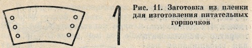 В. Петрик из Краснодарского края для изготовления стаканчиков под рассаду использует полиэтиленовую пленку, которую режет по форме с таким расчетом, чтобы верхняя часть была шире, а нижняя уже (рис. 11). Вырезанную пленку складывает вдвое, можно по несколько штук, и металлическим заостренным пробоем с отверстием внутри (для выхода кусочков пленки) пробивает по краю по три отверстия — форма стаканчика готова. При пробивании отверстий складывать форму обязательно, в противном случае отверстия могут не совпадать.