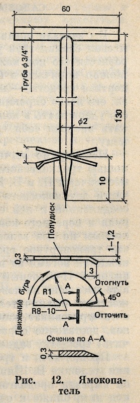 Примерно такое же орудие изготовил А. Мынов из Краснодара. Принципиальная разница между его буром и предыдущим — в окончательной форме полудисков: А. Мынов заточил не только их кромки, но и кончик каждого из них длиной 10—12 мм (рис. 12). После чего плавно отогнул эти мыски вниз. Благодаря этому рабочий орган стал лучше «вгрызаться» в землю — за 1 ч им можно выкопать 10—12 ям диаметром 16— 20 см и глубиной 70—80 см.