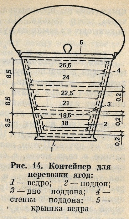 Ну, а как лучше перевозить убранные на участке ягоды, сливы, вишни в городскую квартиру? Н. Жарков из Хабаровска советует делать это с помощью трех сит (рис. 14). Дно каждого сделано из плотного шпона толщиной 2 мм, стенки — из полоски толстого дюралюминия высотой 8,5 см, развернутой на конус. Диаметр дна самого маленького сита — 18, а диаметр верхнего его обреза — 19,5 см. У среднего сита эти параметры соответственно равны 21 и 22,5, у наибольшего — 24 и 25,5 см. По мере заполнения плодами сита по очереди опускают в обыкновенное ведро с крышкой. Получается очень прочный и в то же время легкий контейнер.