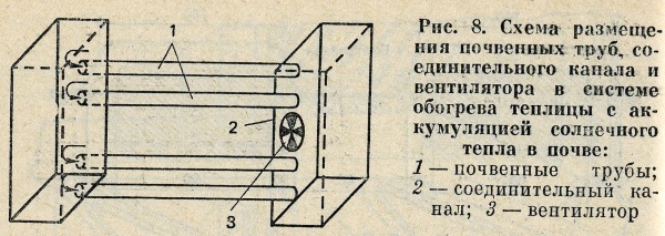 В теплице устанавливают электрический вентилятор мощностью 25—30 Вт. Он забирает воздух из тепличного помещения, прогоняет его по трубам, заложенным в грунте, затем воздух снова поступает в теплицу.