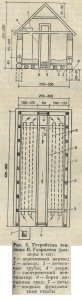 Н. Гаврилов из Москвы рекомендует для овощеводов конструкцию теплицы с замкнутой циркуляцией воздуха, примыкающую к садовому домику. В теплице устанавливают электрический вентилятор мощностью 25—30 Вт. Он забирает воздух из тепличного помещения, прогоняет его по трубам, заложенным в грунте, затем воздух снова поступает в теплицу. Вентилятор и выход почвенных труб в одном из торцов теплицы объединены общим каналом, в другом торце — каждая пара труб выходит в приямок (рис. 8). Канал выполнен из кирпича. Длина его равна ширине теплицы, высота 30, ширина 20 см. Вентилятор вмонтирован в стенку канала, обращенную внутрь теплицы. Чтобы забранный из теплицы воздух равномернее распределялся по ее объему, перед вентилятором под углом 40° поставлена доска. При такой циркуляции воздух, нагретый солнцем, проходя по почвенным трубам, отдает теплоту грунту и поступает опять в теплицу охлажденным (со 100%-ной относительной влажностью). Благодаря замкнутой циркуляции воздуха, днем в теплице температура воздуха понижается до оптимальной. Одновременно температура почвы повышается. Ночью происходит обратный процесс: накопленное в почве тепло согревает воздух в теплице, при этом относительная влажность понижается.