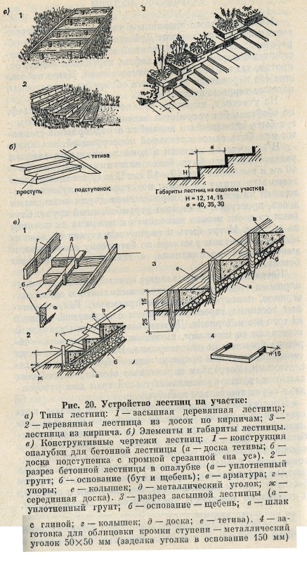 В отличие от лестниц в доме лестницы на садовом участке должны быть более пологими: шириной 35— 40 см и высотой всего 10—12 см. В саду лестницы чаще всего выполняют из досок: подступенком служит положенная на ребро и поддерживаемая двумя колышками доска, проступью — хорошо утрамбованный грунт. Ступени из досок можно выполнить и положив их плашмя на кирпич. Могут быть и кирпичные ступени, уложенные на цементном растворе по бетонному основанию, и выполненные из плитняка, а также из монолитного бетона.