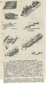 Простейшие деревянные лестницы устраивают, подготавливая вначале наклонное основание. Грунт выравнивают, подсыпают крупный шлак и тщательно утрамбовывают. Затем боковины (тетиву) из цельных досок прочно сбивают с подступенками и, установив на подготовленное основание, закрепляют колышками. Грунт сначала подсыпают к наружной части тетивы и утрамбовывают, затем засыпают ступени, начиная с нижней, и тщательно трамбуют, предварительно смочив водой.